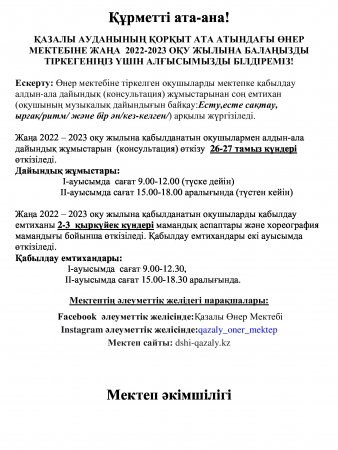 ҚАЗАЛЫ АУДАНЫНЫҢ ҚОРҚЫТ АТА АТЫНДАҒЫ ӨНЕР МЕКТЕБІНЕ ЖАҢА 2022-2023 ОҚУ ЖЫЛЫНА ТІРКЕУ МЕРЗІМІ ТУРАЛЫ ХАБАРЛАМА!