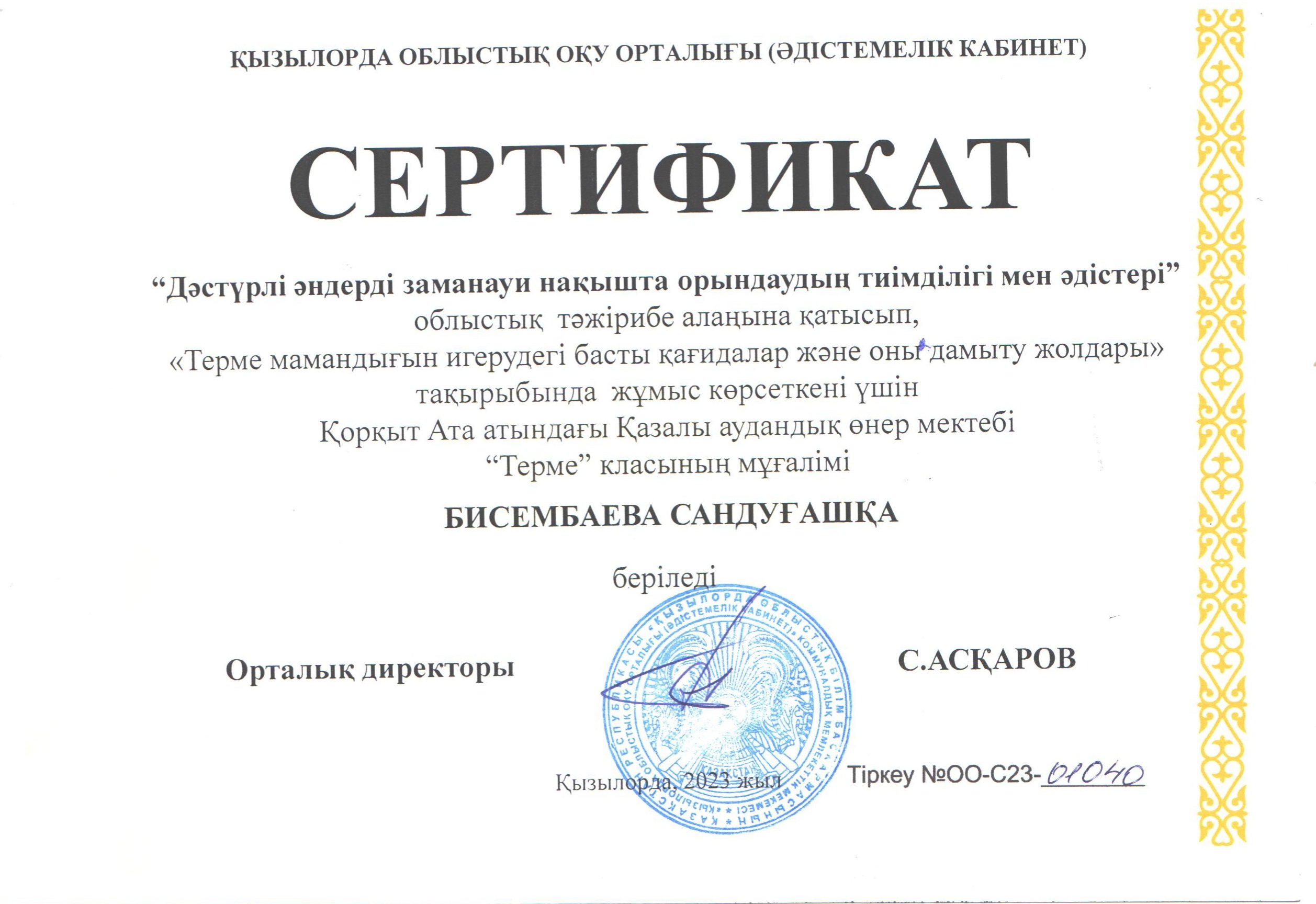 2023 жылғы сәуір айының 12 жұлдызында облыстық оқу орталығының (әдістемелік кабинет) жұмыс жоспарына сәйкес Т.Салқынбайұлы атындағы Қармақшы аудандық өнер мектебінің базасында «Дәстүрлі әндерді заманауи нақышта орындаудың тиімділігі мен әдістері» тақырыбында қосымша білім педагогтарына, яғни музыка,өнер мектептерінің ұстаздары арасында облыстық тәжірибе алаңы ұйымдастырылды.Тәжірибе алаңына қосымша білім беру ұйымы (Өнер мектебі) жыр-терме, халық әні, вокал, домбыра кластары мұғалімдері бойынша барлығы -30 маман қатысты.Тәжірибе алаңының мақсаты-өз халқының рухани қазынасы мен Сыр сүлейлерінің асыл мұрасын терең танысып, халықтық тәрбиемен сусындаған зерделі ұрпақ тәрбиелеу. Жұмыс барысы: «Дәстүрлі әндерді заманауи нақышта орындаудың тиімділігі мен әдістері» тақырыбында тәжірибе алаңы аясында жыр-терме, халық әні, вокал, домбыра кластары мұғалімдері жұмыстарын көрсетіп, тәжірибе алмасты.Аталған облыстық тәжірбие алаңына мектебіміздің ұстаздары терме мамандығы бойынша Бисембаева Сандуғаш, домбыра мамандығы бойынша Байдаулетова Мейрамкүл және вокал мамандығының мұғалімі Кермеш Сәкен өз іс-тәжірбиелерімен бөлісу мақсатында іс-тәжірбиелік жұмыстарын жоғары үлгілік деңгейде көрсете білді. Терме мамандығы бойынша «Терме мамандығын игерудегі басты қағидалар және оны дамыту жолдары» тақырыбында Бисембаева Сандуғаш,