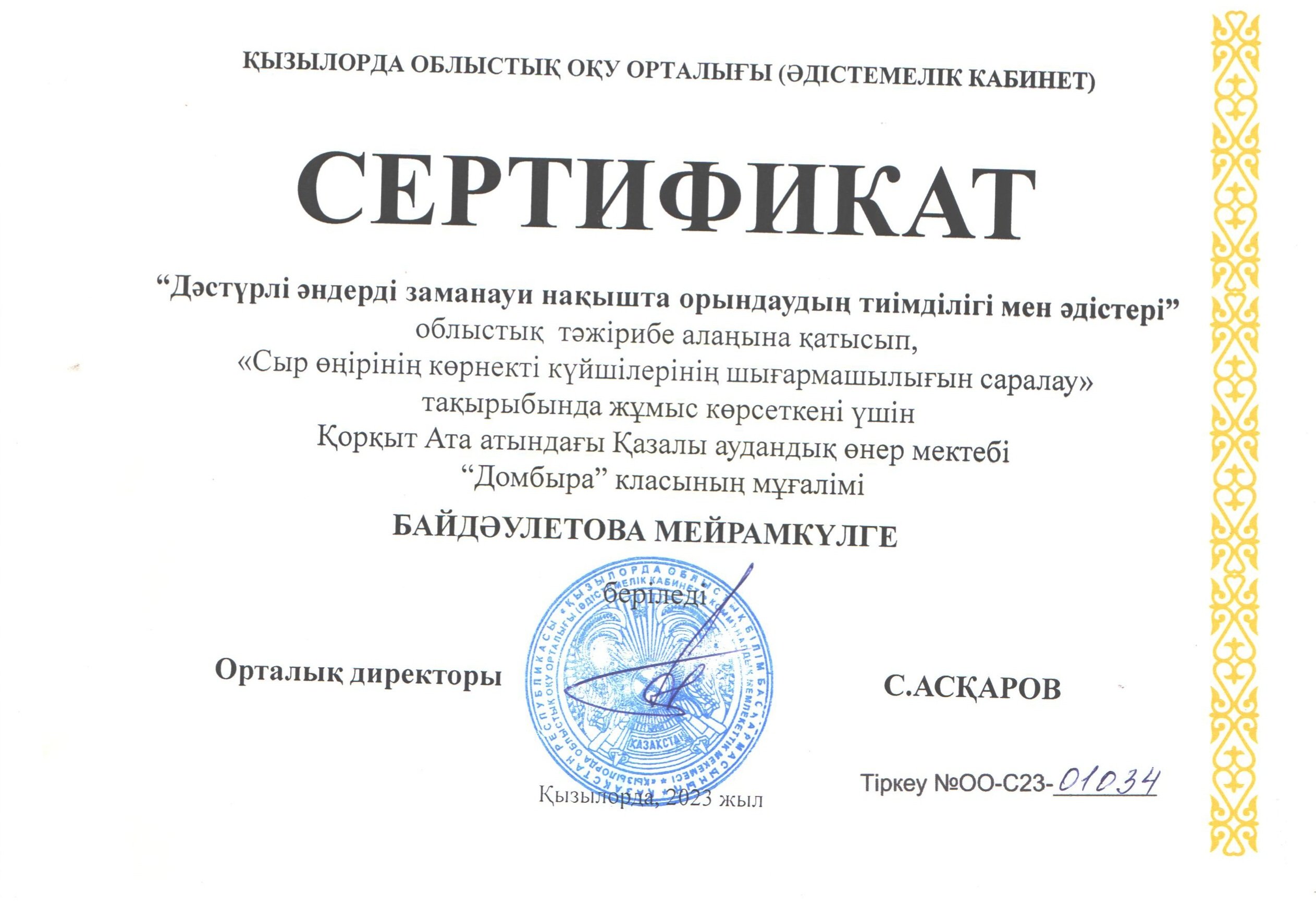 домбыра мамандығы бойынша «Сыр өңірінің көрнекті күйшілерінің шығармашылығын саралау» тақырыбында Байдаулетова Мейрамкүл