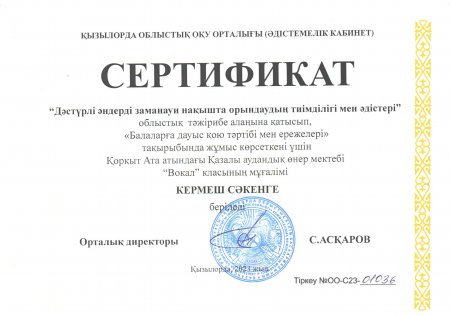 және вокал мамандығы бойынша «Балаларға дауыс қою тәртібі мен ережелері» тақырыбында Кермеш Сәкен